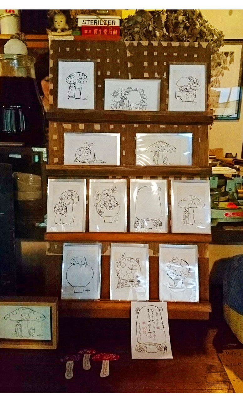 えー、これらが、今回空カフェで、飛ぶよぉにお嫁入りしております、コーチはじめ「ひるさがりのきのこ」記念ポストカードの全貌。 、、全貌っつう割には反射してさっぱり見えネなコレ駄目だなコレは、、 全12種類、キノコを描いております。 に、ネコとかインコとか、てみちゃんとか、絡めたりすて。 欲しくなって買いに来られるつもりの方は、頑張って拡大してご覧になられ、品さだめしとくと良いかと思います。 迷ってウナだれて「おススメはどれですかぁー、、」と聞かれる方もいらして、コレとコレ!と言うと、ため息をつきながら、ゆっっっくりと抜き取られ。 なんんとも言えないクセになりそぉな可愛い動作と時間ですた。 インクジェット出力の、1枚100円(税込み)。 頑張って生産しますけども品切れの折はご免なさいでもって。