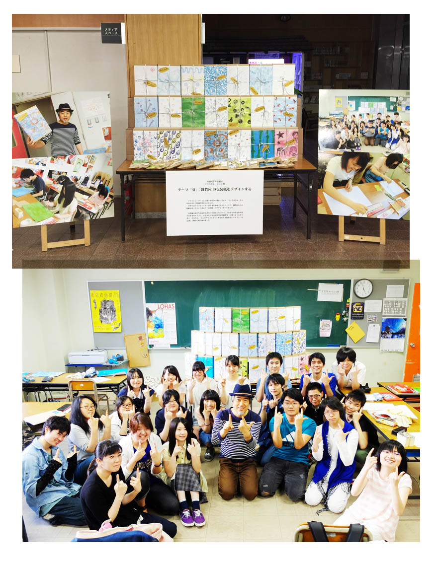 先週行った、イラストレーション科の特別授業。 で生まれた作品群と、授業風景の写真がパネルになって、ロビー(だと思うんだけど)に展示されております。 郡山駅東口、方八町の、国際アート&デザイン専門学校。 ヨコシマな服を着てオダッているのが、私でございます。 学生達には、雑貨屋さんの夏のキャンペーンギフト用の包装紙、をお題にコサえてもらったんだけど、やっぱり「青」方向の、爽やかな作品が多かったかなぁ。 面白かったですた。 イラストレーターには必ずあたえられる2つ、「お題」と「締切り」の中でもって、どんだけ本領発揮、のびのびした表現ができるか、を鍛えとくと良いなぁと思いますた。
