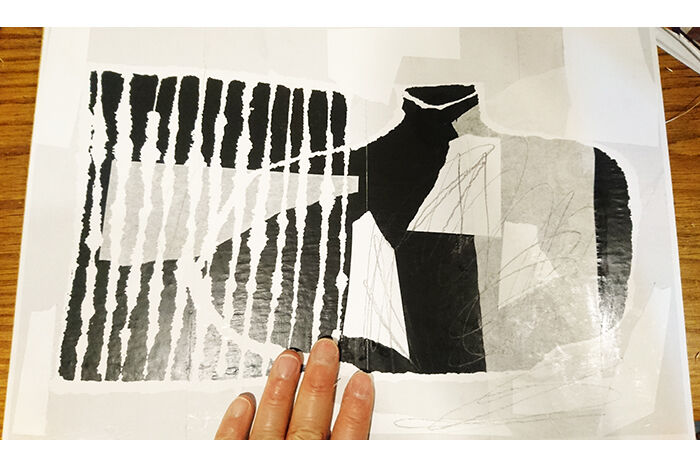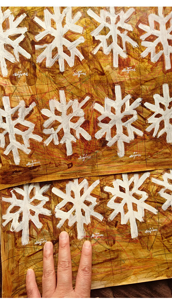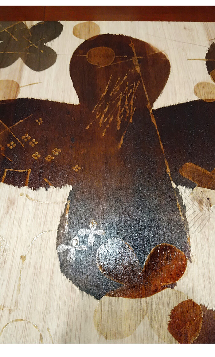 厚さ13ミリほどの合板に、塗料や紙など色々な画材を使って、天板のみをコサえます。このあと、 4B、6B、10Bの鉛筆でもたくさん線をひくので、「えんぴつの天板」と名付けております。写真は工程の20%位で、まだここからじゃんじゃん重ねて描いていき、最後にはウレタンニスを3重塗りするので、様相が変わります。