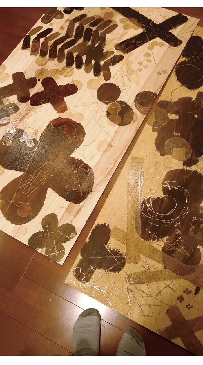 んんんん。面白い効果が出ておる。と思うなぁぁ。色々な塗り方を試しておりますが。友人デザイナーの事務所の打ち合わせ室のテーブルの天板を製作中。手描きによる原画の天板。受注から3年。待たせ過ぎにもほどがあるじゃんねごめんなさいね。